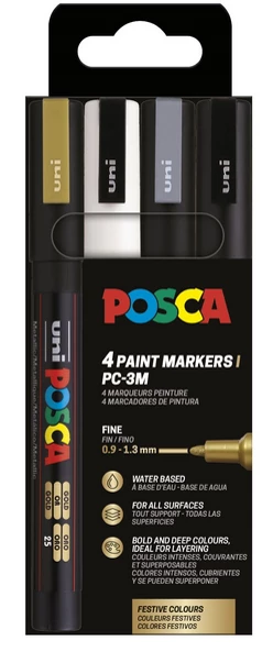 Et sæt med fire Posca PC‑3M tuscher med en stregbredde på 0,9–1,3 mm – perfekt til både præcis linjeføring og lidt større farveflader.